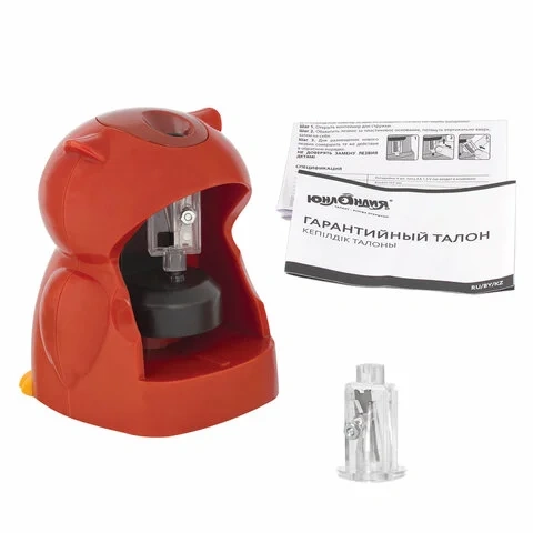 Точилка с ярким корпусом в виде совы, выполненным из ударопрочного пластика, и прочным прямым лезвием поможет ребенку быстро и качественно заточить любые деревянные и пластиковые карандаши диаметром 6-8 мм. Подходит как для чернографитных, так и для цветных карандашей. Имеет противоскользящее основание. Механизм приходит в движение при помощи электричества от 4 батареек АА (в комплект не входят) и оснащен предохранительным клапаном и сменным лезвием. Затачивание начинается автоматически после помещения карандаша внутрь точилки. Для правильной заточки необходимо удерживать карандаш от вращения. Уже через несколько секунд он идеально заточен и готов к использованию.