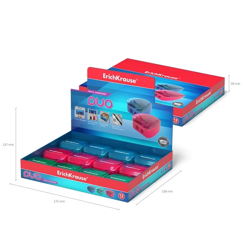Точилка ErichKrause Duo, пластиковая, два отверстия с контейнером, цвет ассорти