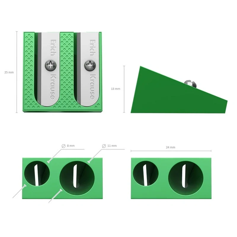 Металлическая точилка ярких цветов типа металлик сдвумя отверстиями диаметром 8 мм и 11 мм для заточки стандартных и утолщенных (Jumbo) карандашей. Высококачественное никелированное брендированное лезвие из углеродистой стали гарантирует высокую производительность.