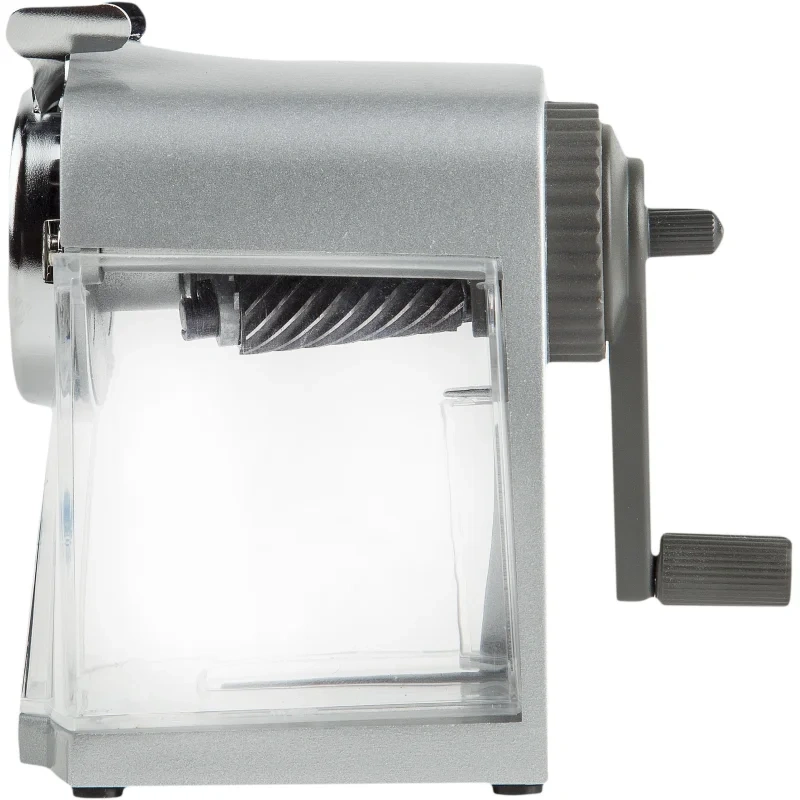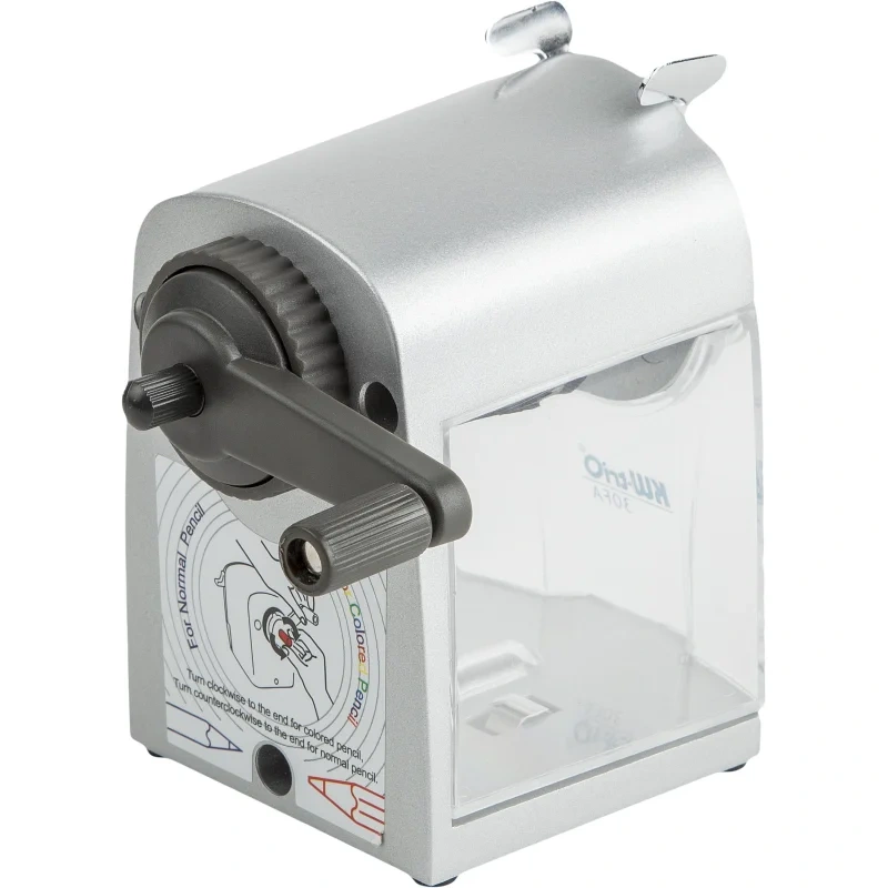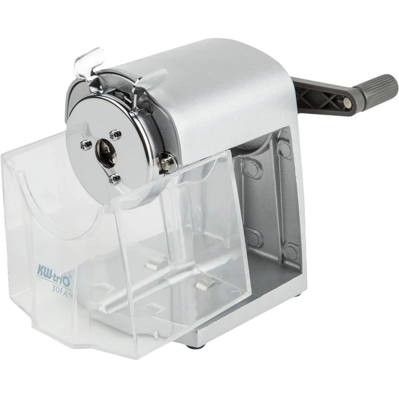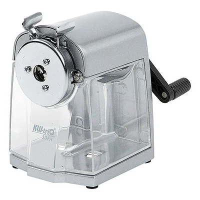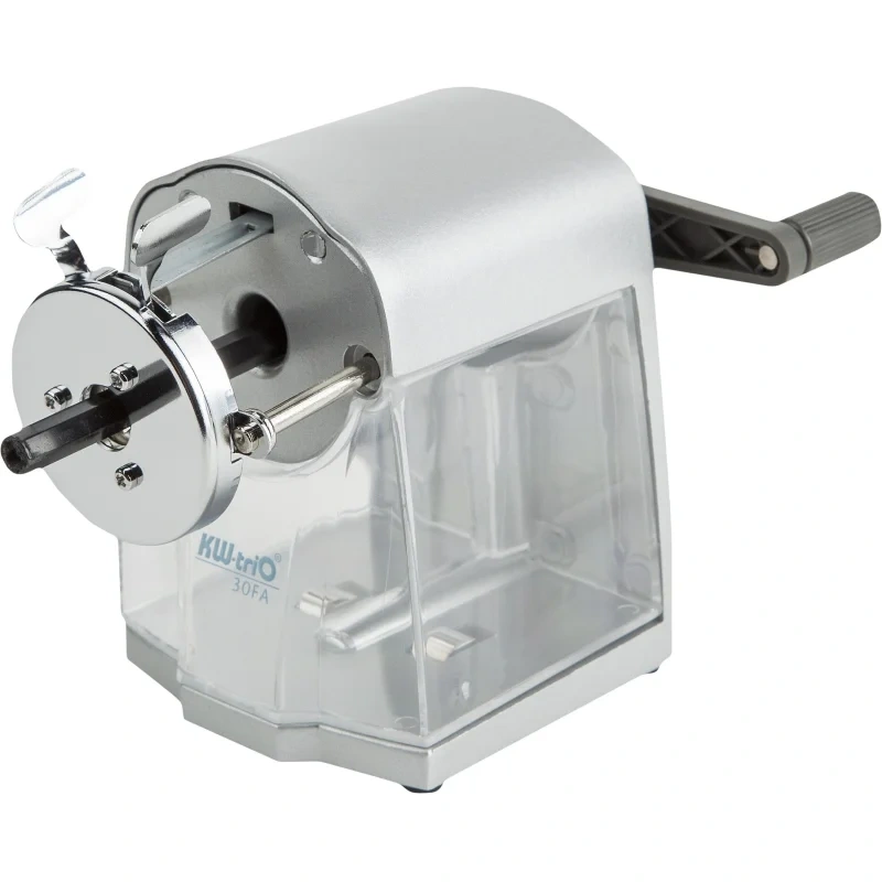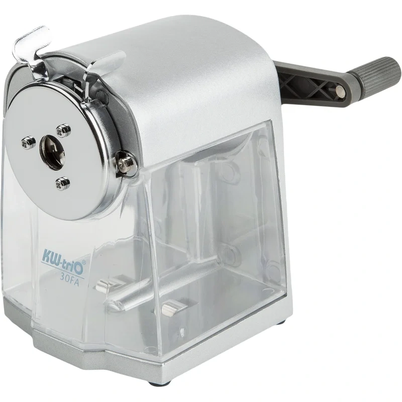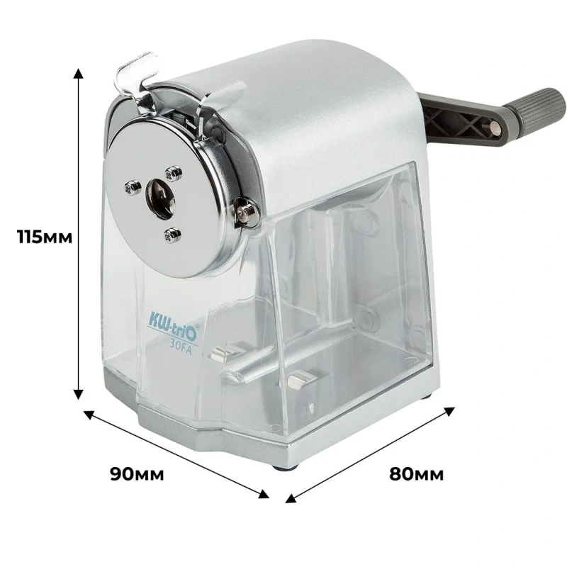 Точилка для карандашей механическая KW-Trio 30FA. Механическая точилка ’мельница’ в пластиковом корпусе с одним отверстием. Предназначена для заточки чернографитных и цветных карандашей диаметром от 7 до 12 мм. Подходит для круглых, трехгранных, шестигранных карандашей. Точилка оборудована переключателем вида карандашей. Поворот колеса на задней стороне точилки по часовой стрелке для цветных карандашей, против — для чернографитовых. Точилка может крепиться к поверхности стола с помощью струбцины, которая идет в комплекте. Пластиковый серебристый корпус. Запасные ножи отсутствуют, комплектные служат 5 лет. Размер 115×90×80 мм.