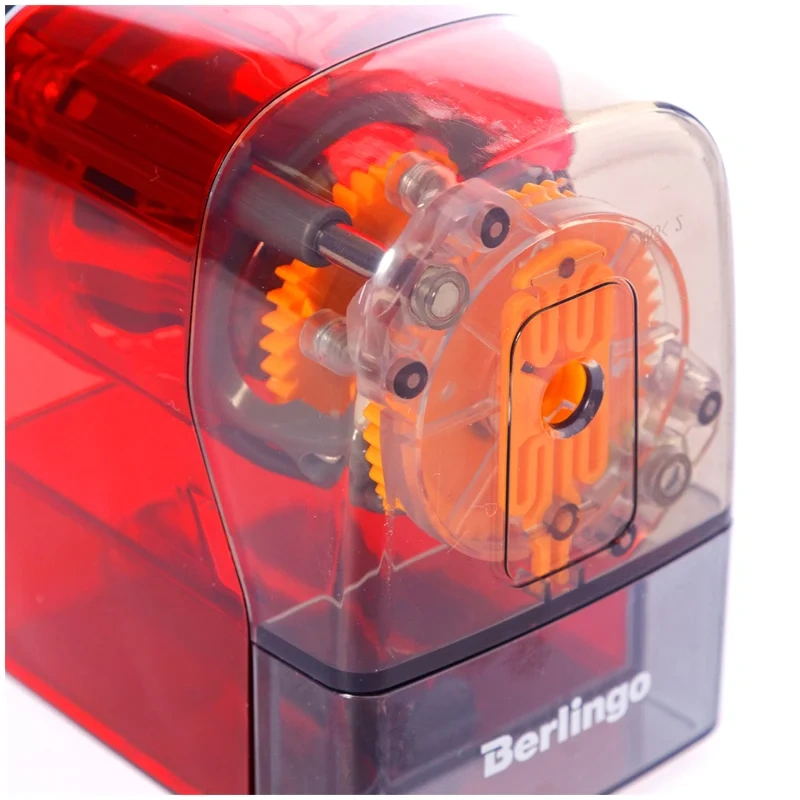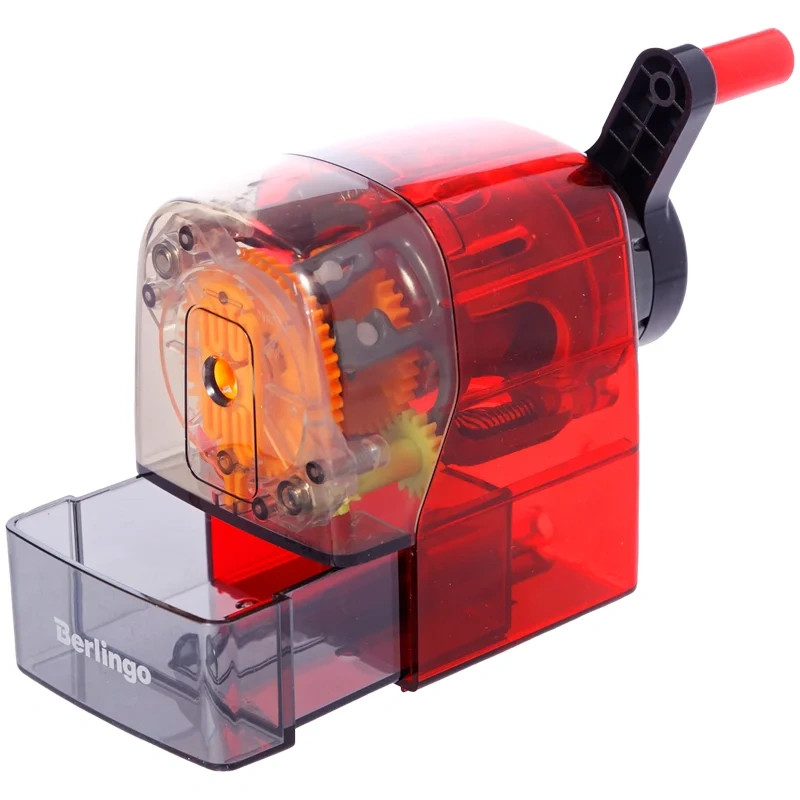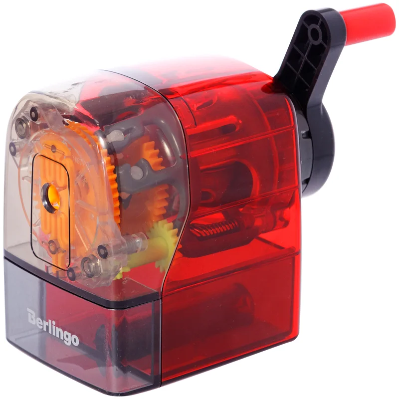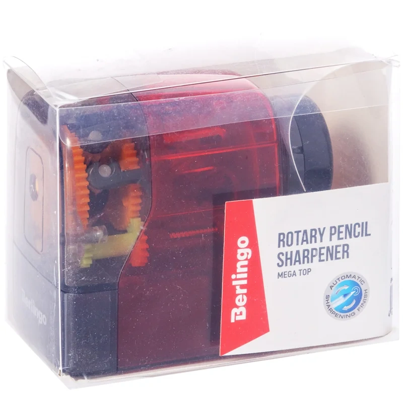 Настольная механическая точилка Berlingo 'Mega Top'. Цвет корпуса красный. Особая конструкция механизма обеспечивает быструю и острую заточку карандаша, предотвращает грифель от поломок в процессе заточки. Уникальная технология самоизвлечения карандаша после окончания заточки - достаточно только продолжать вращать ручку до полного извлечения. Защита от застревания грифеля в механизме. Полупрозрачный корпус. Струбцина для крепления к столу в комплекте. Упаковка в индивидуальный прочный пластиковый бокс. Штрих-код на каждой упаковке.