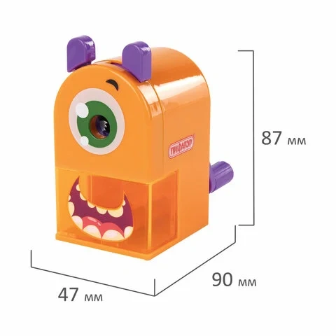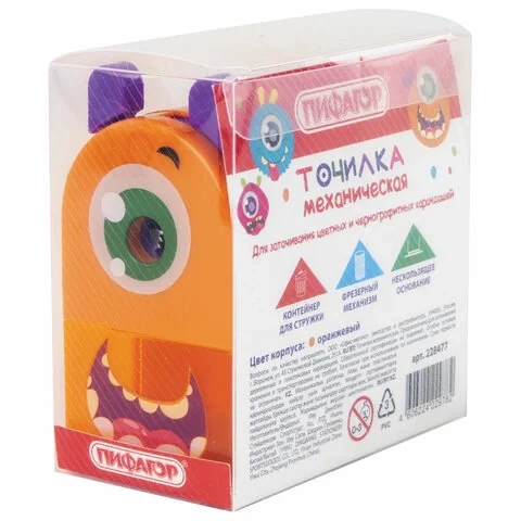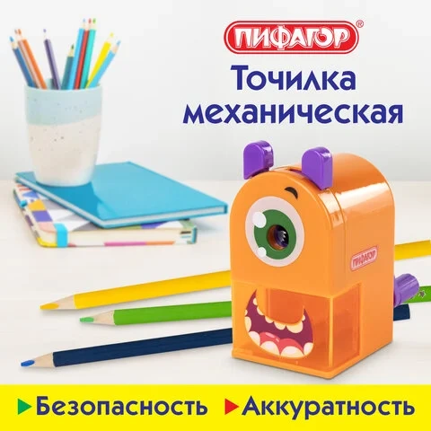 Точилка механическая ПИФАГОР 'Монстрик', корпус оранжевый, для чернографитных и цветных карандашей,