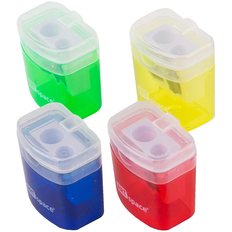 Товар, предназначен для затачивания карандашей. Точилка имеет 2 отверстия, цвета корпуса - ассорти.