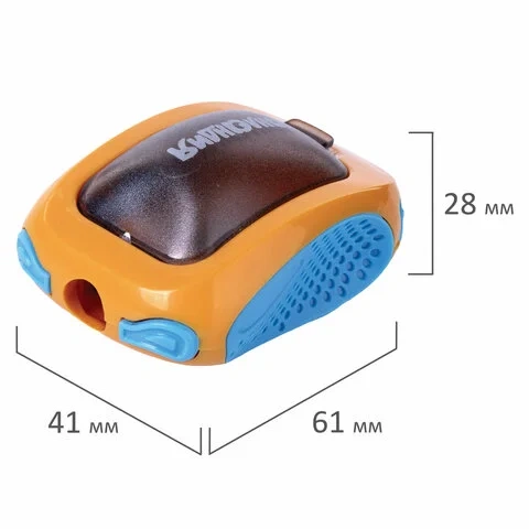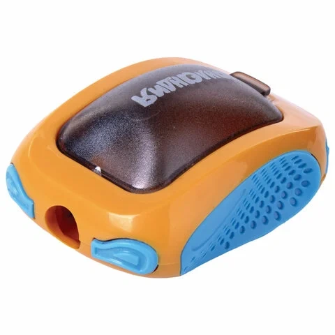 Эргономичный корпус в форме машины выполнен из пластика. Снизу на корпусе расположены подвижные колёса. Острое стальное лезвие обеспечивает быструю и легкую заточку. Карандаш затачивается аккуратно, а опилки остаются в специальном контейнере. Размер - 28х41х61 мм.