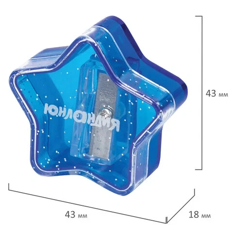 Корпус выполнен из пластика. Острое лезвие обеспечивает высококачественную и точную заточку. Карандаш до 8 мм затачивается легко и аккуратно, а опилки остаются в специальном контейнере. Компактные размеры (43х43х18 мм) позволят поместить точилку в пенал, а благодаря интересной форме звездочки она не затеряется на парте или столе среди других принадлежностей.