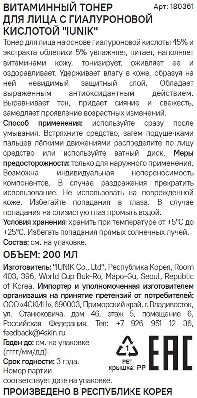 Тонер для лица Iunik витаминный с гиалуроновой кислотой, 200мл