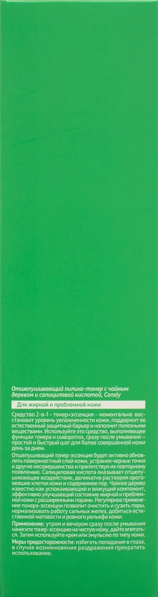 Отшелушивающий тонер-эссенция будет активно обновлять поверхностный слой кожи, устраняя черные точки и другие несовершенства и препятствуя их повторному появлению. Салициловая кислота оказывает отшелушивающее воздействие, деликатно растворяя ороговевшие клетки кожи и содержимое пор. Чайное дерево известно как успокаивающий и вяжущий компонент, эффективно улучшающий состояние жирной и проблемной кожи с расширенными порами. Регулярное применение тонера-эссенции позволит очистить и сузить поры, нормализовать работу сальных желез, добиться естественной матовости и ровного рельефа кожи. Для жирной и проблемной кожи. Применение: утром и вечером сразу после умывания нанесите тонер-эссенцию на чистую кожу, дайте впитаться. Затем используйте крем или эмульсию по типу кожи. Меры предосторожности: избегать попадания в глаза, в случае возникновения раздражения прекратить использование.