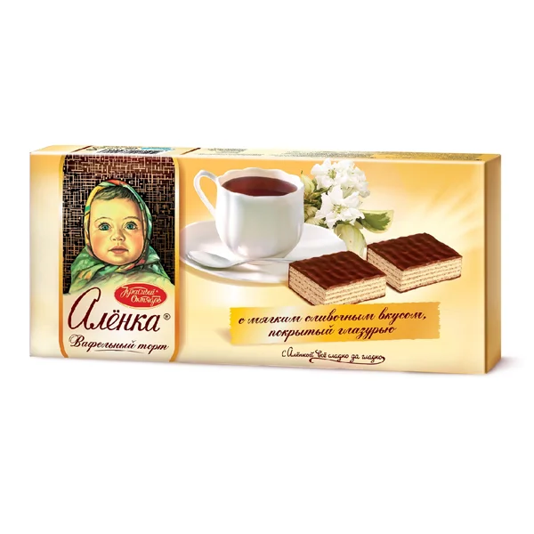 Вафельный торт «Алёнка» – это тонкие слои воздушных вафель с прослойками из сливочного крема. Сверху торт покрыт молочно-шоколадной глазурью. Насыщенный аромат молочного шоколада, нежный сливочный вкус и веселый хруст воздушных вафель и нежная, тающая сладость. Торт «Алёнка» превратит любое чаепитие в настоящий праздник!