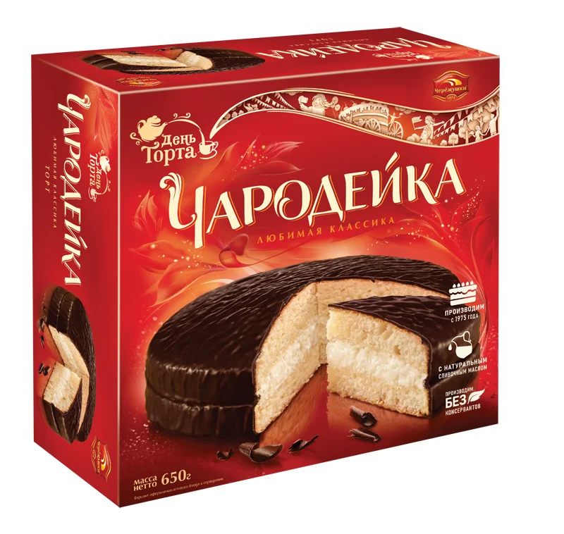 Торт Черемушки Чародейка, 650г — легендарный торт, изготовленный из высококачественных, отборных ингредиентов. В основе – 2 пышных бисквитных коржа, прослоенных нежнейшим кремом. Поверхность торта залита шоколадной глазурью. Кусочек этого лакомства станет идеальным дополнением к чашечке свежезаваренного черного чая без сахара. Чародейка непременно порадует вас отменным вкусом и приятной, тающей во рту текстурой.