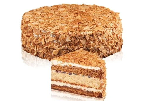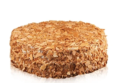 Домашний итальянский торт на медовом и карамельном бисквитах с шоколадным кремом дульче, кремом сгущёнка на основе карамельного шоколада, с добавлением чилийского чернослива и хрустящей вафлей. Торт украшен крошкой из вафли.