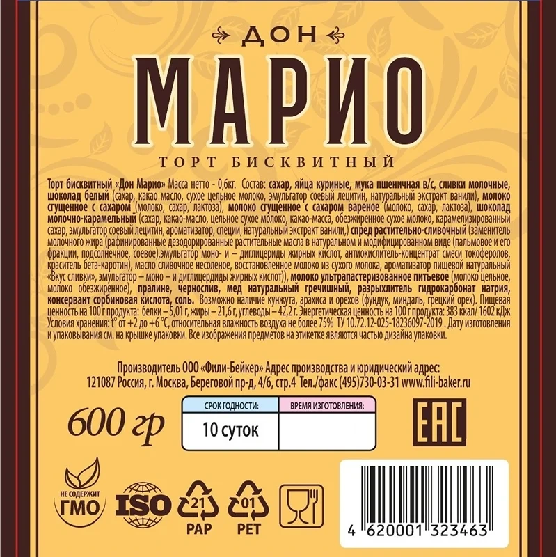 Торт Фили Бейкер Дон Марио бисквитный, 600г