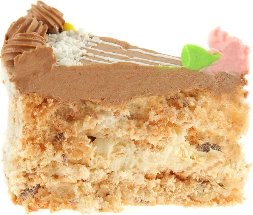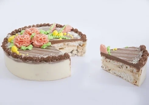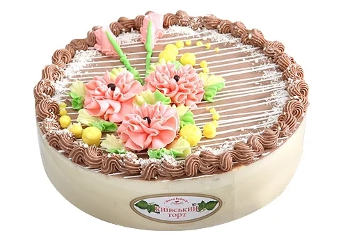 Состоит из воздушного безе с фундуком и двух видов нежного крема сливочного и шоколадного. Готовый десерт украшен красочным декором в виде цветов.