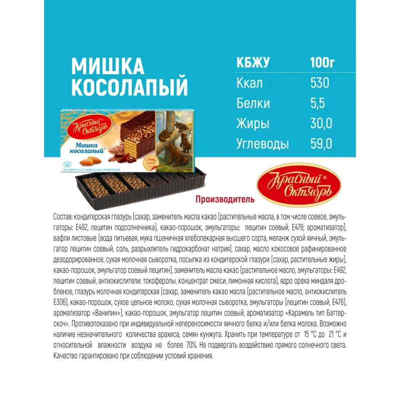 'Мишка косолапый' - ассорти тортиков из тонких хрустящих вафель с кремовой прослойкой, покрытых шоколадной глазурью, а также обсыпанных измельченными ядрами миндаля и темной шоколадной крошкой. В коробке 6 порций. Состав: глазурь кондитерская (сахар, заменитель масла какао (частично гидрогенизированные растительные масла: рапсовое масло, пальмовое масло, антиокислители: лимонная кислота, токоферолы, концентрат смеси, лецитин подсолнечника), какао порошок, эмульгатор лецитин соевый, ароматизатор Ваниль), вафли листовые (вода питьевая, мука пшеничная хлебопекарная высшего сорта, меланж сухой яичный, эмульгатор лецитин соевый, соль, разрыхлитель гидрокарбонат натрия, масло подсолнечное рафинированное дезодорированное), сахар, масло кокосовое рафинированное дезодорированное, сухая молочная сыворотка, посыпка из кондитерской глазури (сахар, гидрогенизированные растительные жиры (пальмовые, пальмоядровые, кокосовые), какао-порошок, эмульгатор соевый лецитин), заменитель масла какао (растительные масла: частично гидрогенизированное пальмовое масло, частично гидрогенизированное рапсовое масло, антиокислители: лимонная кислота, токоферолы, концентрат смеси, лецитин подсолнечника), ядро ореха миндаля дробленое, глазурь молочная кондитерская (сахар, заменитель какао масла (частично гидрогенизированные фракции пальмового масла, сорбитан тристеарат, лецитин), какао-порошок, сухое цельное молоко, сухая молочная сыворотка, эмульгаторы: лецитин соевый, Е476, ароматизатор Ванилин), какао-порошок, кэроб (порошок плодов рожкового дерева), эмульгатор лецитин соевый, ароматизатор Карамель тип Батткрскоч. Противопоказано при индивидуальной непереносимости белка молока и/или яичного белка. Возможно наличие незначительного количества семян арахиса, семян кунжута. Пищевая ценность в 100 г продукта: белки - 5,5 г, жиры - 30 г, углеводы - 59 г. Энергетическая ценность в 100 г продукта: 530 ккал. Хранить при температуре от +18С до +21C и относительной влажности воздуха не более 70%. Не подвергать воздействию прямого солнечного света.