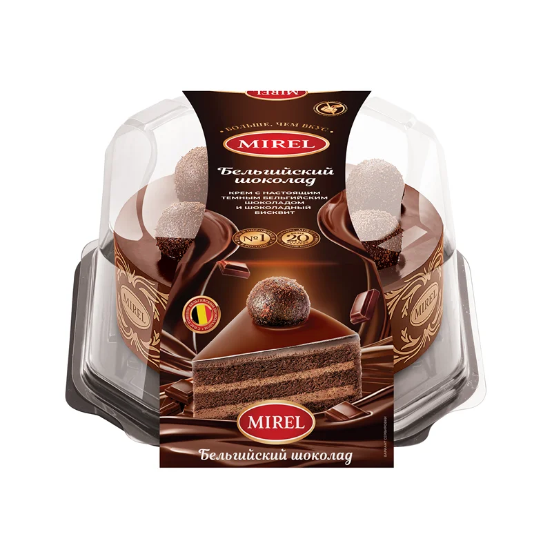 Торт Mirel Бельгийский шоколад, 750г состоит из крема с настоящим темным бельгийским шоколадом и шоколадным бисквитом с легкой коньячной ноткой.