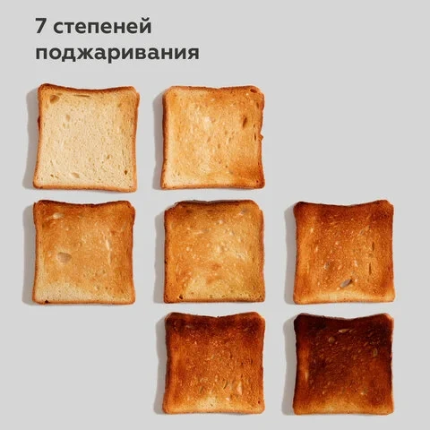 Модель с корпусом из нержавеющей стали имеет мощность 850 Вт, что обеспечивает быстрый нагрев. Для вашего удобства предусмотрено 7 режимов поджаривания, позволяющих точно настроить степень прожарки хлеба.