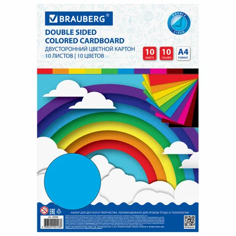 Картон цветной А4 ТОНИРОВАННЫЙ В МАССЕ, 10 листов 10 цветов, 180 г/м2, BRAUBERG, 129308