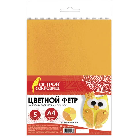 Фетр цветной для творчества Brauberg 5 цветов, А4, 5 листов, оттенки желтого