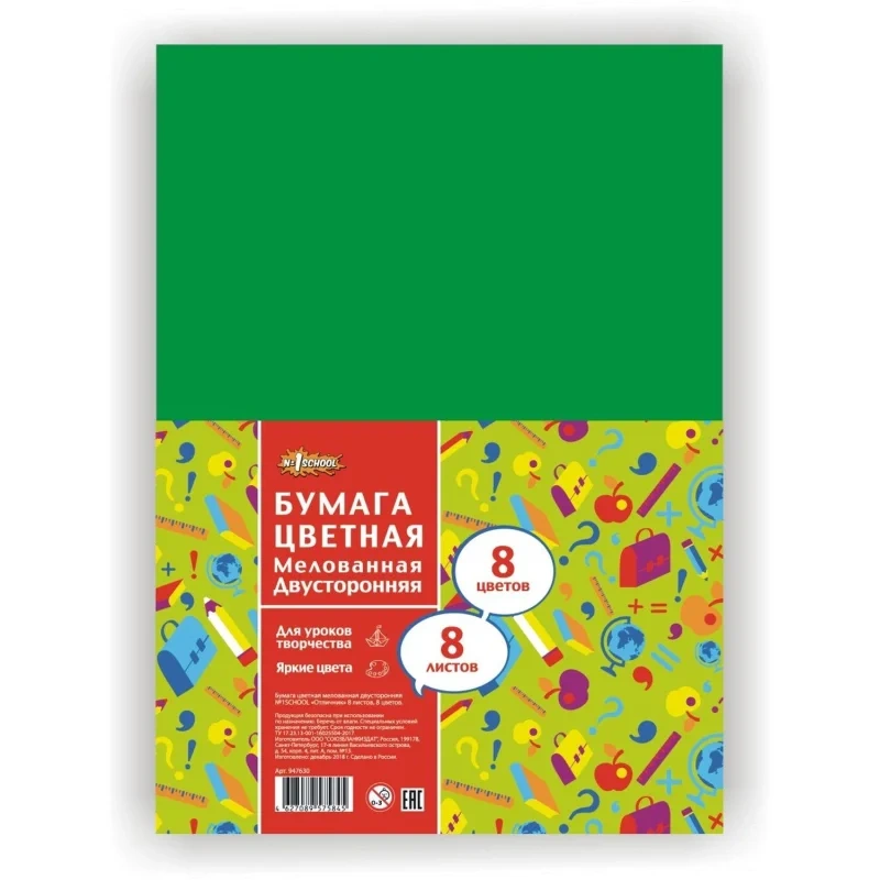 Бумага цветная №1School 8л.8цв.А4 мелован двусторон Отличник
