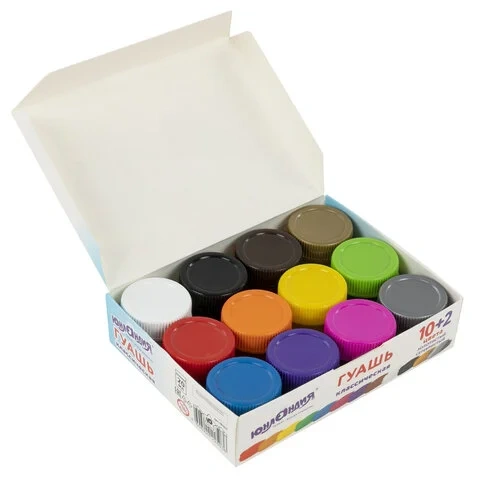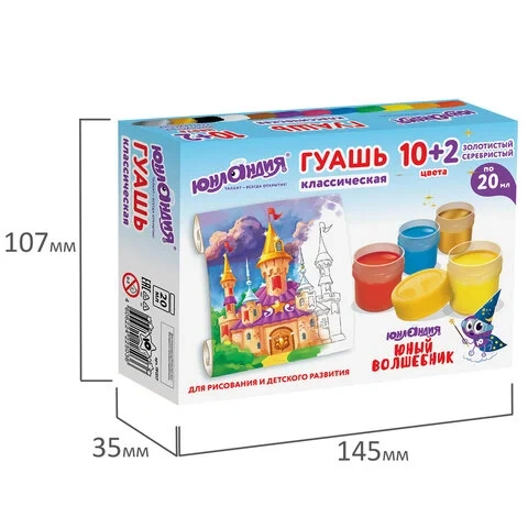 Гуашь ЮНЛАНДИЯ 'ЮНЫЙ ВОЛШЕБНИК' 10+2 цвета (золотистый+серебристый) по 20 мл, без кисти, картонная у