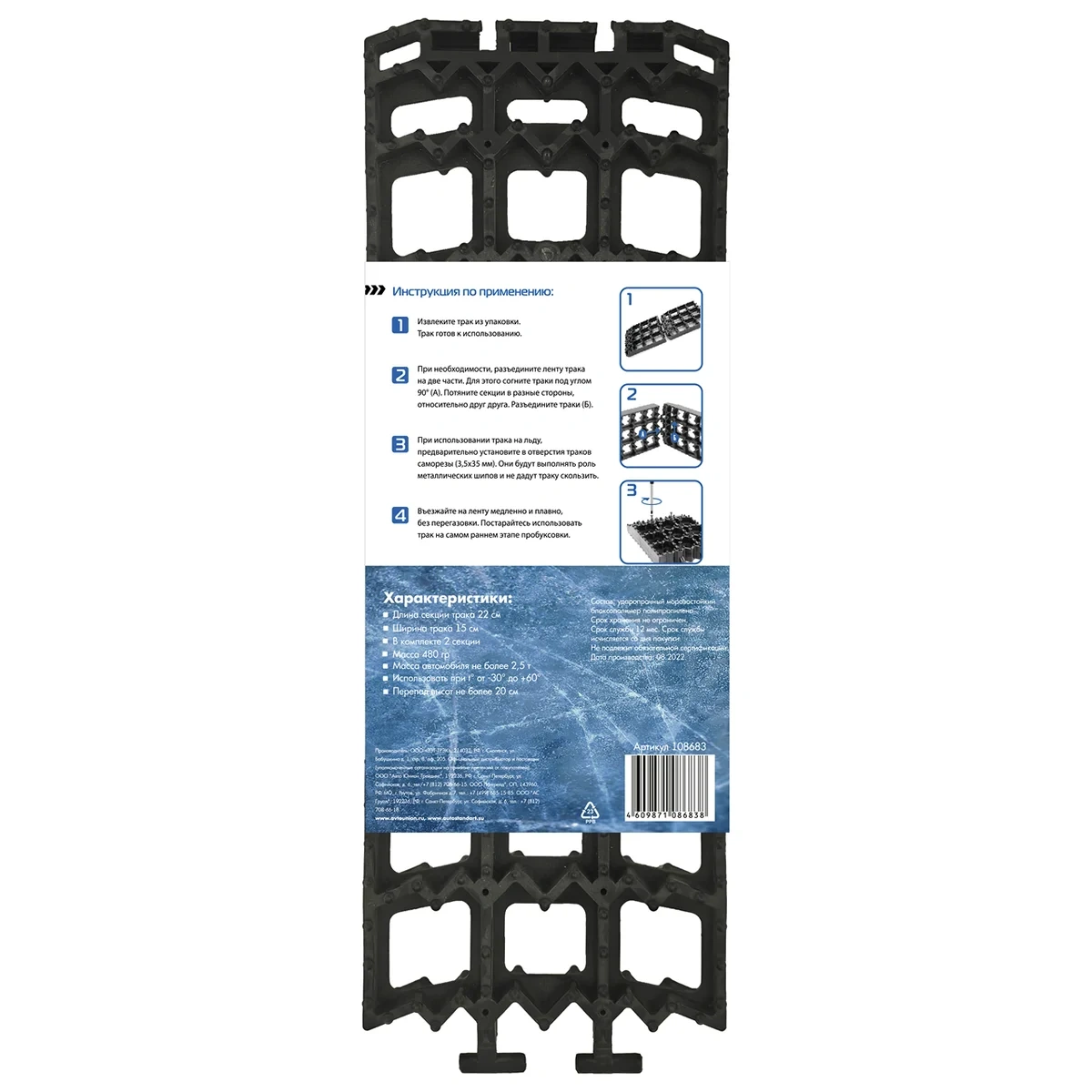 Трак предназначен для использования в снегу, грязи, песке и на льду. Специальная Z-образная структура решетки обеспечивает оптимальное сцепление с колесом. Использование трака снижает динамические нагрузки на узлы трансмиссии автомобиля. Длина ленты 44см, ширина 15см. Комплект состоит из двух секций. Масса 480г. Подходит для автомобилей массой не более 2,5т. Устанавливается при перепаде высот не более 20см.