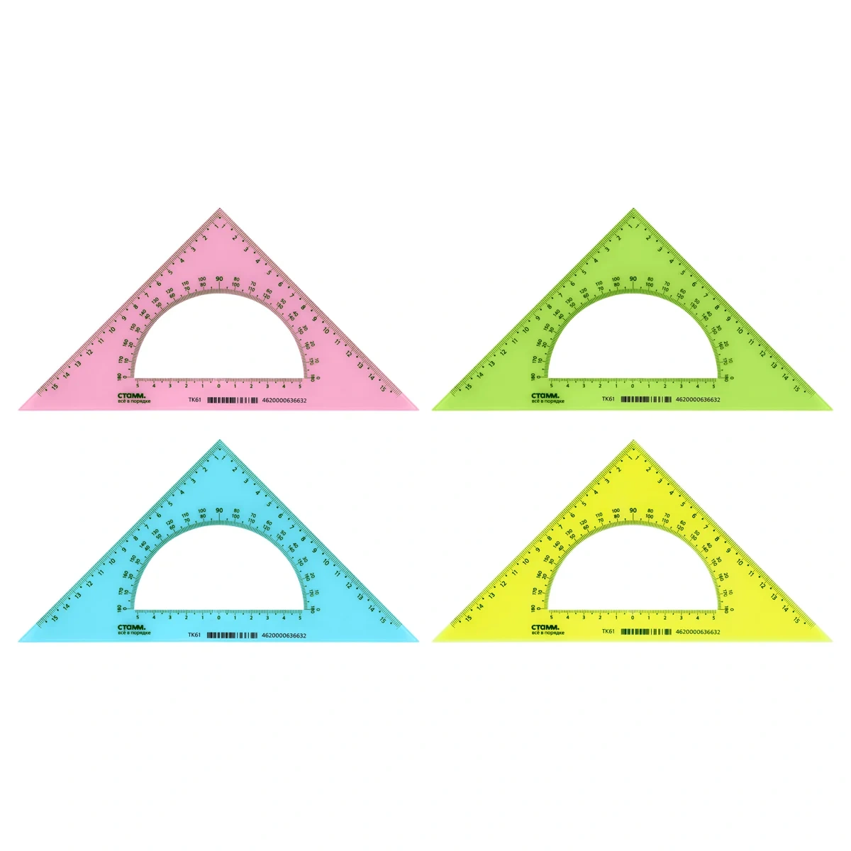 Треугольник СТАММ Neon Crystal с транспортиром – незаменим для чертёжных и измерительных работ. Угол изделия – 45°, длина шкалы – 16 см. Треугольник имеет чёткую напечатанную миллиметровую шкалу и гладкую глянцевую поверхность. Представлен в неоновых цветах ассорти.
