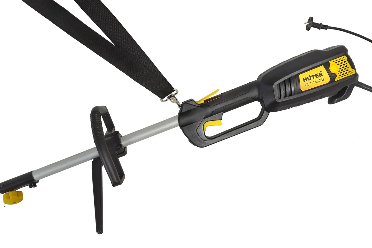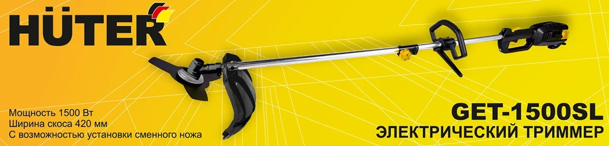 Электрический триммер GET-1500SL Huter. Подключается электрокоса Хутер в обычную электросеть 220 вольт. Двигатель находится в верхней части косы. Режущий инструмент - леска 2 мм и стальной нож. Ширина захвата - 250/350мм. Штанга прямая с редуктором, разъемная, электротриммер удобный в перевозке и хранении. Наплечный ремень снимает нагрузку с рук и равномерно распределяет вес электрокосы. Заказать недорогой электротриммер Huter GET-1500SL стоит для загородного дома, дачи, стрижки простого, естественного газона, многолетних сорняков и высокого сухостоя на полях.