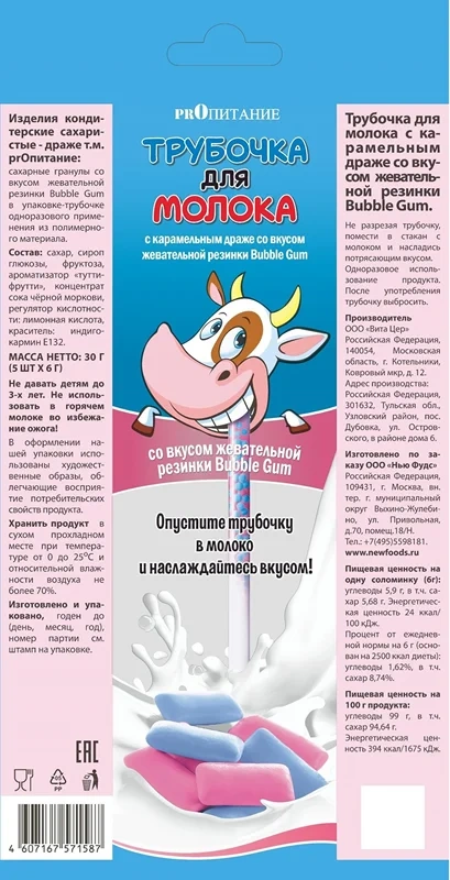 Премиум-трубочки для молока Proпитание Bubble Gum — разработка компании New Foods, не имеющая аналогов. Вкус коктейлей меняется, стоит лишь начать пить их через такую трубочку! Привычный продукт превращается во что-то новое и необычное. Напиток не только удобно пить. Он становится оригинальным и ещё более вкусным! Не надо никаких дополнительных добавок! Изделие абсолютно безопасно и экологично. Трубочка полностью изготовлена из натуральных ингредиентов. В её составе нет красителей и консервантов, а количество сахара сведено к минимуму. Продукт не содержит лактозу, глютен, ГМО, а также сою и крахмал.