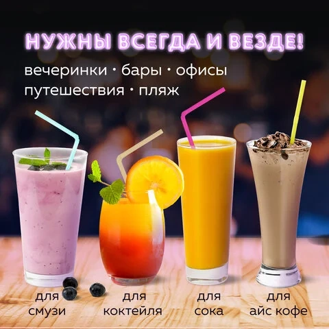 Трубочки диаметром 5 мм идеальны для подачи воды, сока, морса, лимонада, холодного чая и кофе, алкогольных и безалкогольных коктейлей и других напитков. При изгибе трубочки гофра не деформируется и при желании возвращается в исходное положение. Коктейльные трубочки - неотъемлемый аксессуар любого фуршета, пикника, детского праздника или домашней вечеринки. Материал: полипропилен. Длина трубочки 240 мм, поставляются в комплекте 250 штук. Упаковка - полипропиленовый пакет.