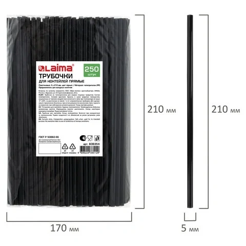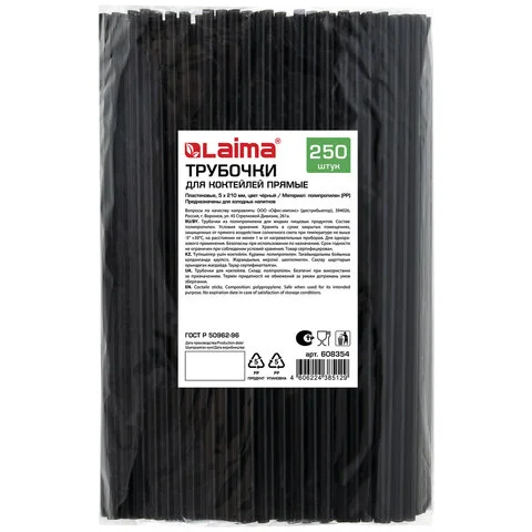 Трубочки для коктейлей Laima черные, прямые, пластиковые, d=5мм, 21см, 250шт/уп