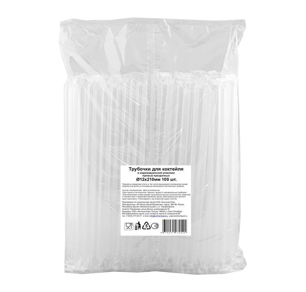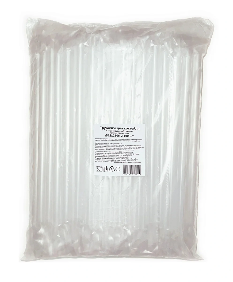 Трубочка для коктейля одноразовая пластиковая прозрачная в индивидуальной упаковке 23см, 100шт