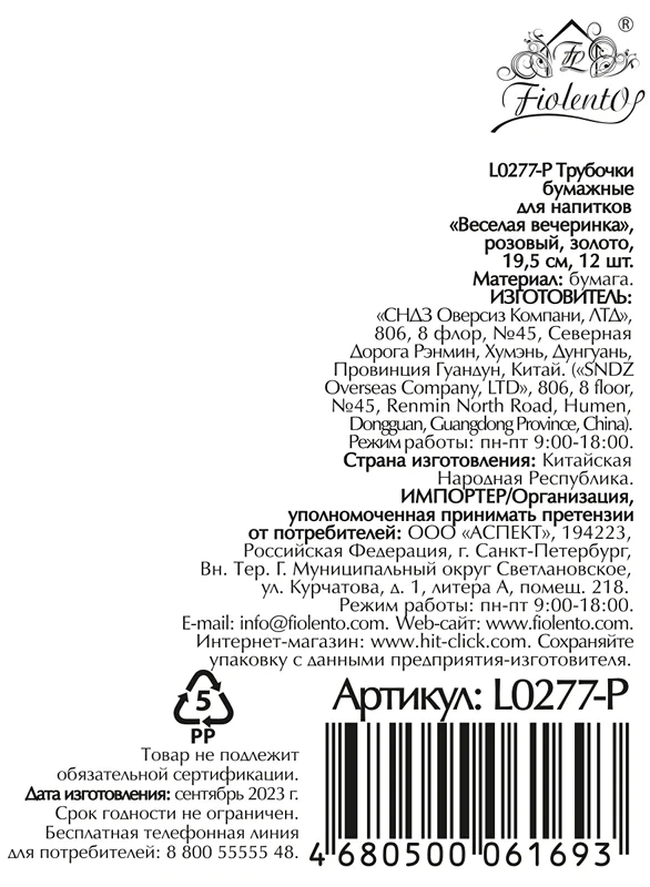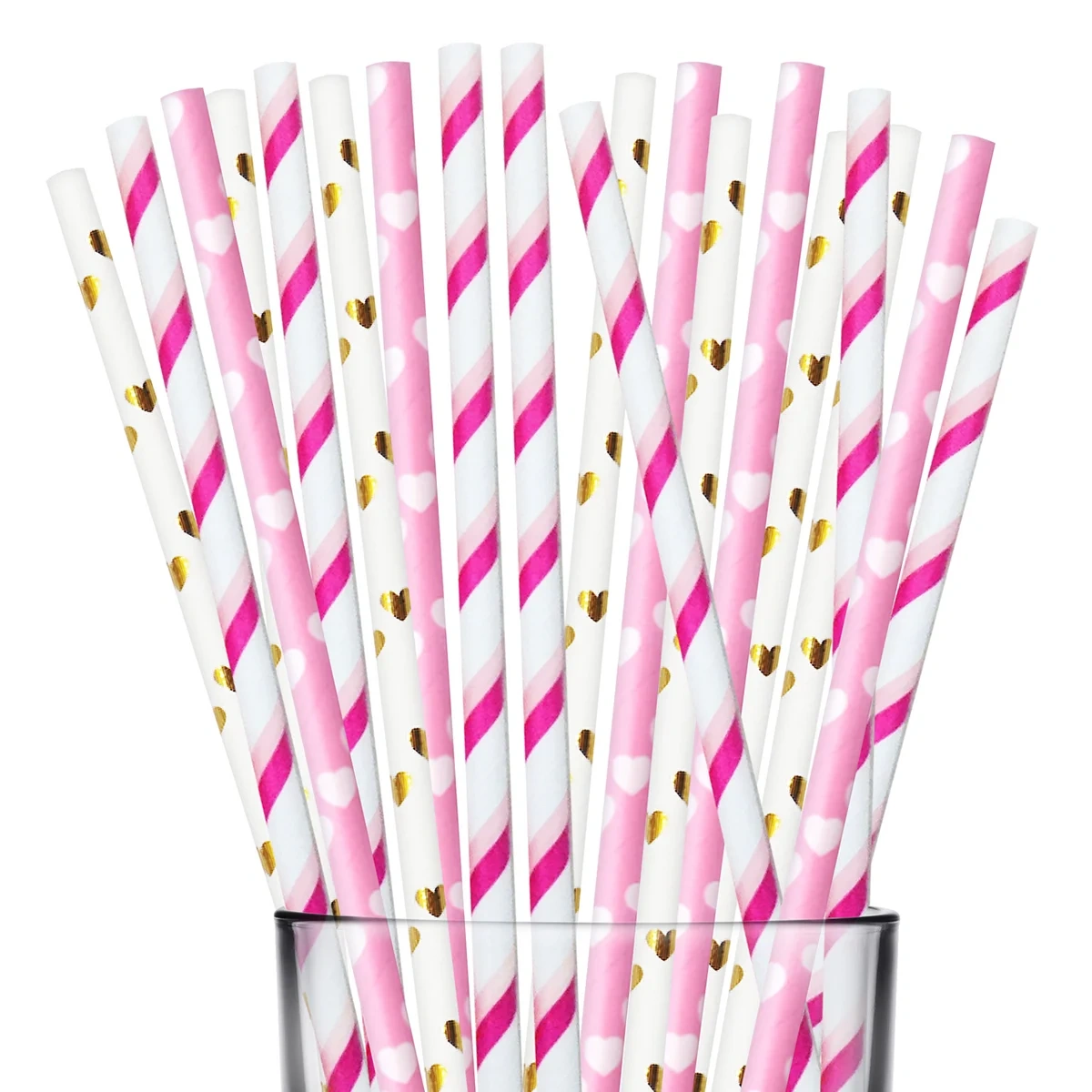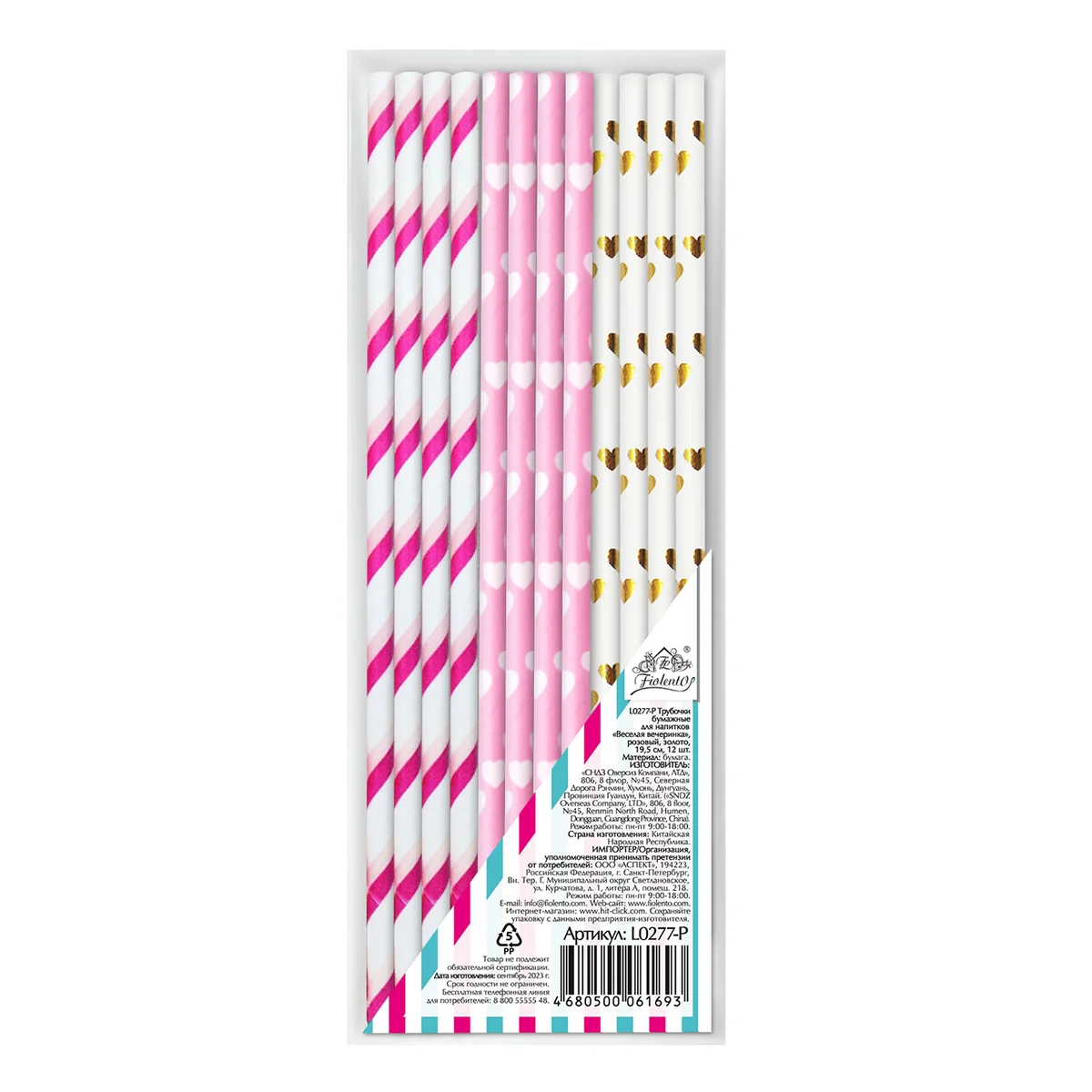 Трубочка для напитков одноразовая Fiolento Веселая вечеринка бумажная золотисто-розовая 19.5см, 12шт