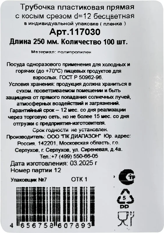 Трубочки для коктейлей цветные, прямые, d=12мм, 125шт/уп