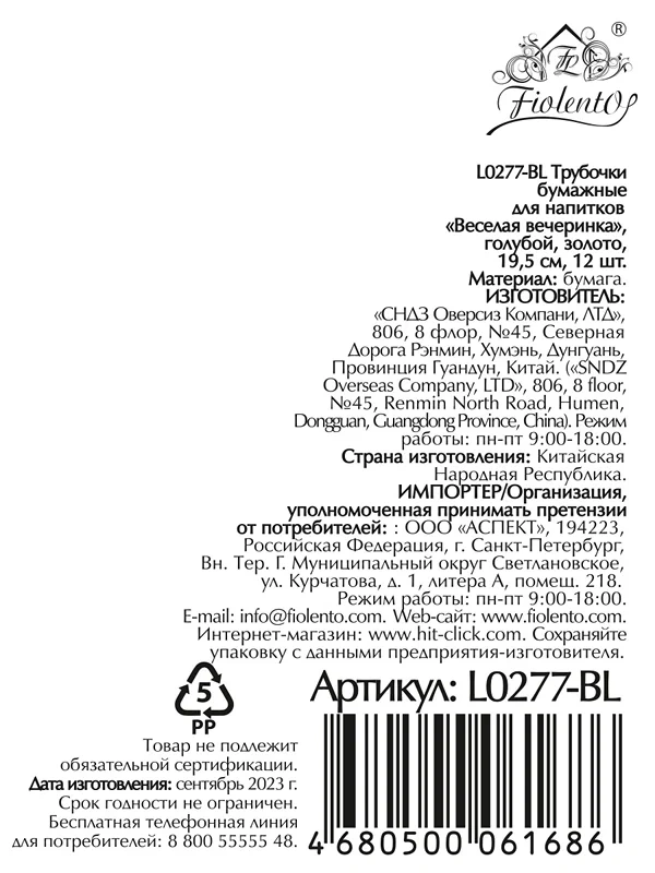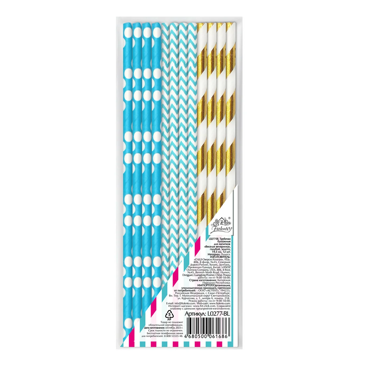 Трубочка для напитков одноразовая Fiolento Веселая вечеринка бумажная золотисто-голубая 19.5см, 12шт