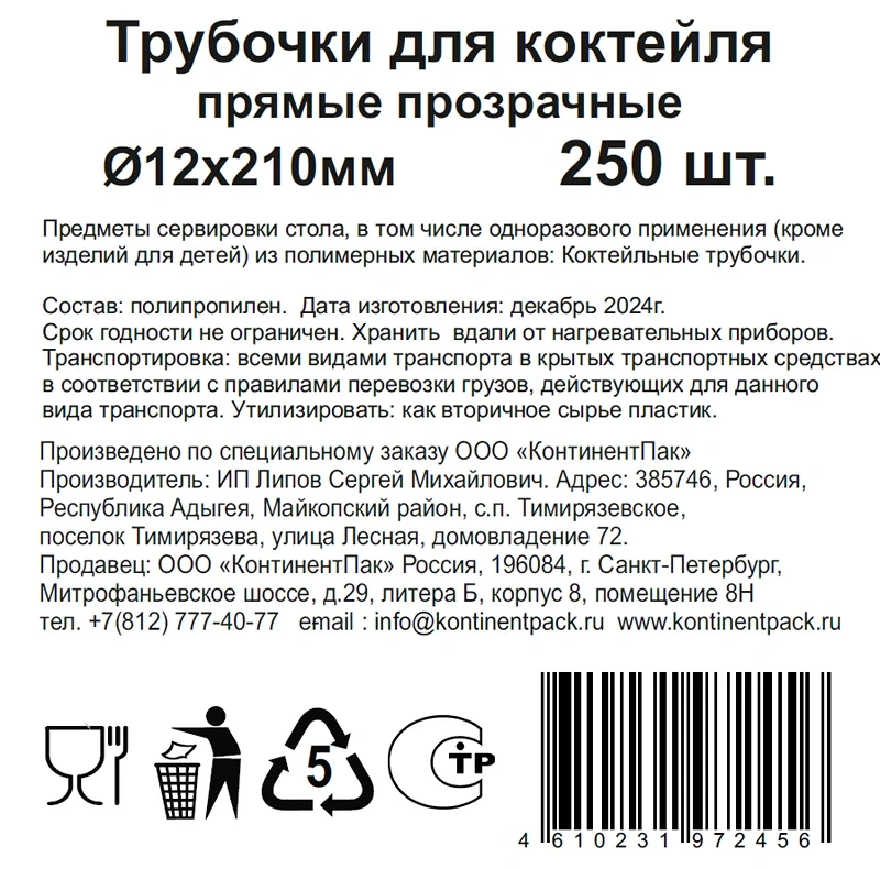Трубочки для коктейля Континентпак прозрачные пластиковые 12 мм 21см, 250шт