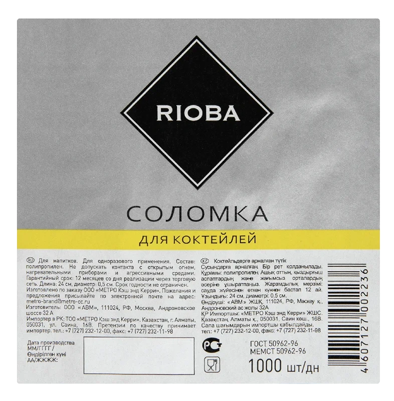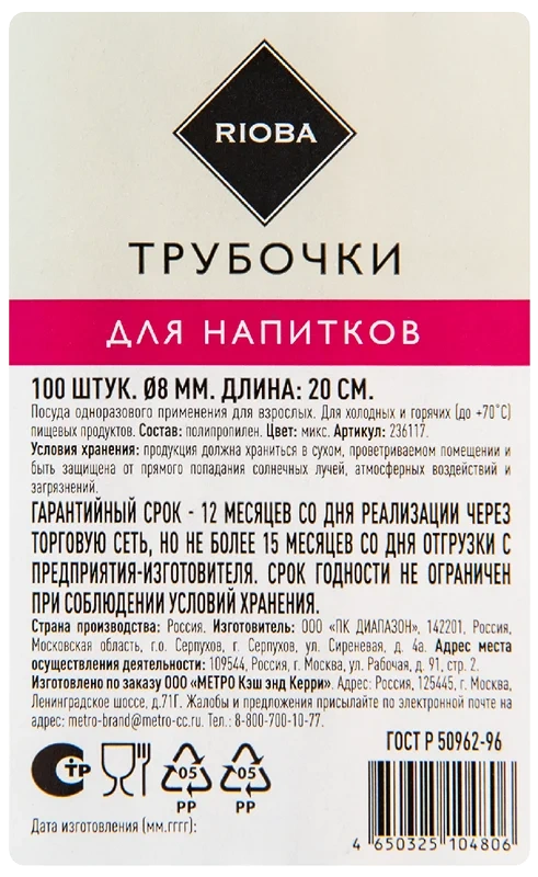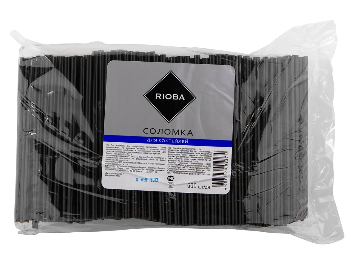 Трубочки для коктейлей Rioba черные, без изгиба, d=0.5см, 13см, 500шт/уп