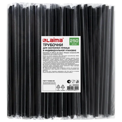 Трубочки для коктейлей Laima черные, прямые, в индивидуальной упаковке, d=8мм, 24см, 250шт/уп