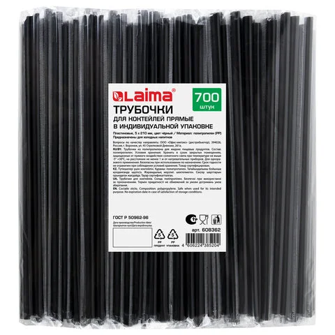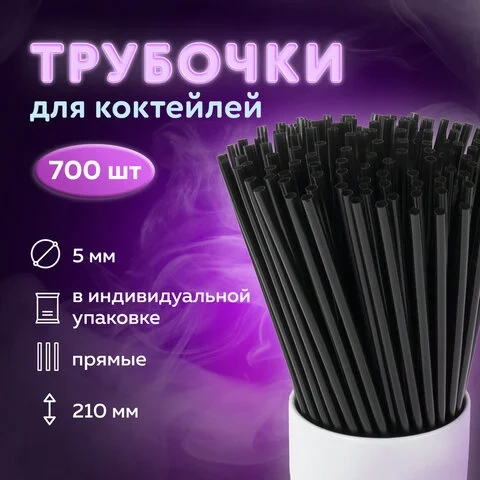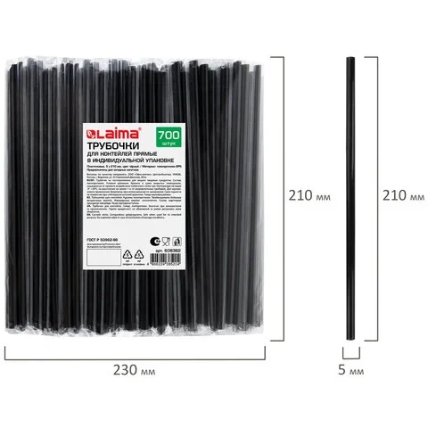 Трубочки для коктейлей прямые в индивидуальной упаковке, 5 х 210 мм, черные КОМПЛЕКТ 700 штук, LAIMA