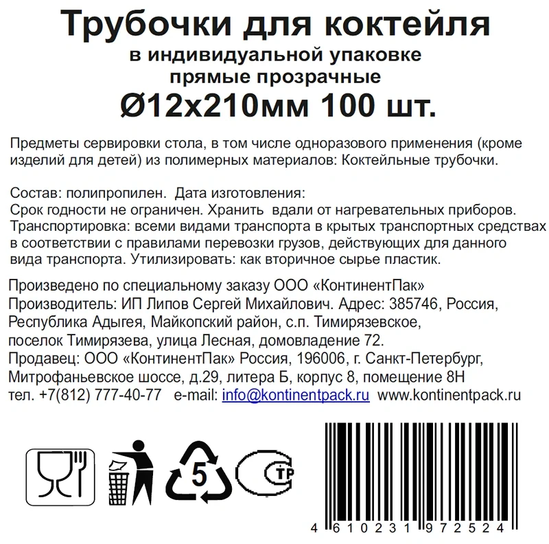 Трубочки для коктейлей Континентпак прозрачные пластиковые 21см 12мм, 100шт