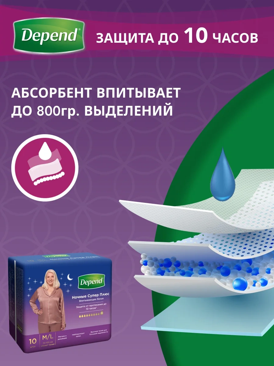 Трусы подгузники для взрослых ночные обеспечивают надежную защиту и комфорт. Разработаны специально для женщин, они мягкие и дышащие. Впитывающее нижнее белье Depend действует в течение 10 часов, гарантируя сухость и свежесть. Обладают способностью впитывать до 800 грамм выделений, что делает их идеальным выбором на ночь. Впитывающее белье Депенд для женщин имеет высокую талию и широкий диапазон охвата, соответствуя обхвату талии от 70 до 105 см. Этот дизайн обеспечивает повышенную надежность благодаря высокому уровню защиты от протекания. Трусики подгузники деликатно нейтрализуют запахи, не маскируя их, что позволяет чувствовать себя комфортно в любых обстоятельствах. Трусы урологические для взрослых легкие, удобные и практически неощутимые при носке. Это позволяет заниматься повседневными делами без ограничений движения. Для женщин важно ощущать уверенность в каждой ситуации — с трусами урологическими от Depend это становится возможным. Эти трусы подгузники женские обеспечивают максимальную защиту во время сна или длительного пребывания без возможности сменить изделие. Включают девять штук в упаковке и адаптированы как для использования послеродового периода, так и при недержании мочи. Они способны предоставить необходимую уверенность благодаря технологии впитывания супер плюс уровня. Подгузники трусы Depend женские размер M / L станут оптимальным решением из коллекции впитывающего нижнего белья depend для женщин всех возрастов. Среди прочих преимуществ следует отметить внимательное отношение к нежной коже — мягкие материалы препятствуют образованию раздражений или опрелостей. Надежная защита ночью обеспечивается за счет усовершенствованной структуры впитывающих слоев — они эффективны даже при обильных выделениях. Трусики подгузники долговечны в течение всей ночи или успешного завершения дня без неприятных ощущений. Подходят как одноразовые изделия после родов или временного восстановления функций организма женщины.