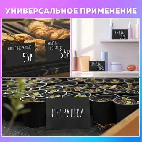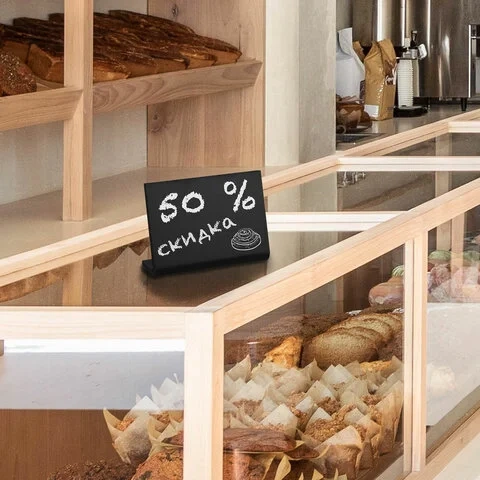 Ценники меловые A6 (10,5x14,8 см), комплект из 10 шт. L-образная форма не требует отдельного держателя, наклейки или подставки – ценник легко расположить на любой горизонтальной поверхности. Материал ценника – ПВХ черного цвета, толщина 3 мм. Упаковка комплекта – термоусадочная пленка.