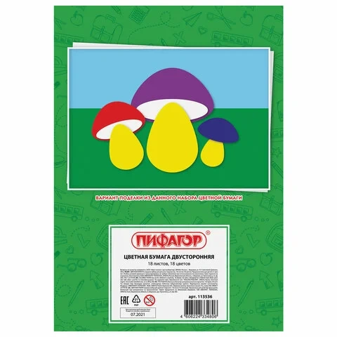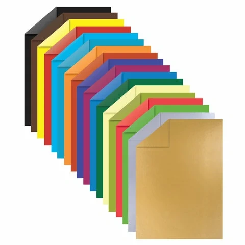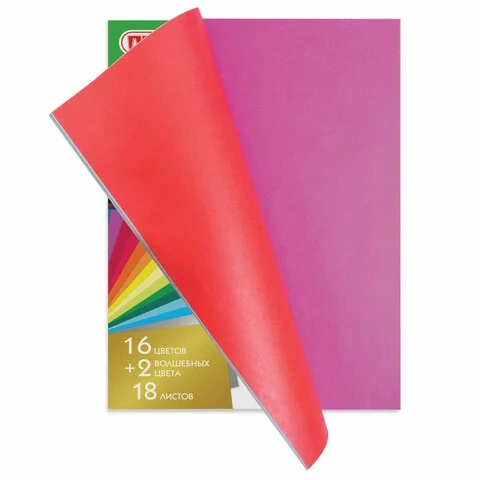 Набор двусторонней цветной бумаги включает 16 листов формата А4 (200х280 мм) газетной бумаги плотностью 50 г/м2 и 2 листа мелованной бумаги плотностью 80 г/м2 в 10-ми разнообразных и насыщенных однородных цветах с содержанием золотого и серебряного цвета. Листы скреплены скобами, легко режутся и сгибаются. Бумага прокрашена с двух сторон.