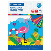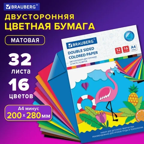 Цветная бумага А4 2-сторонняя офсетная, 32 листа 16 цветов, на скобе, BRAUBERG, 200х280 мм, 'Фламинг