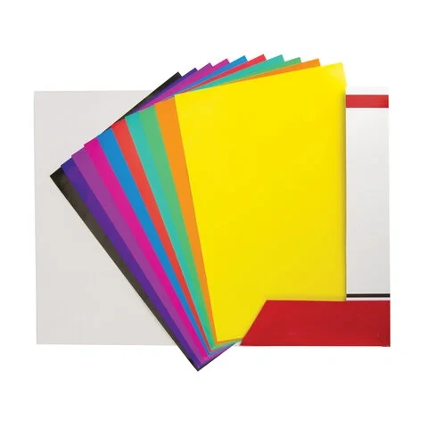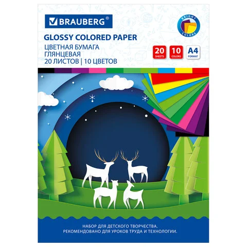 Набор мелованной (глянцевой) односторонней цветной бумаги плотностью 80 г/м2 включает 20 листов формата А4 (210х297 мм) в 10-ти разнообразных и насыщенных однородных цветах. Листы упакованы в картонную папку, легко режутся и сгибаются.