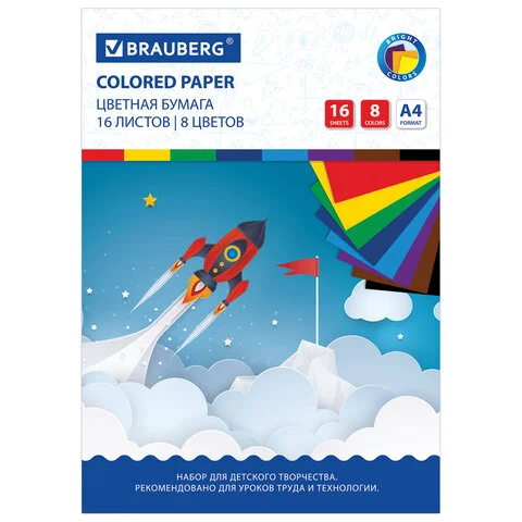 Цветная бумага А4 офсетная, 16 листов 8 цветов, на скобе, BRAUBERG, 200х275 мм, 'Космос', 129919
