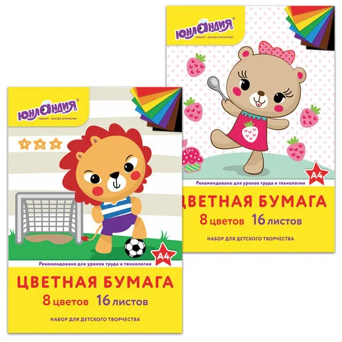 Набор односторонней цветной бумаги плотностью 65 г/м2 включает 16 листов формата А4 8-ми различных цветов. Листы надежно скреплены скобами.