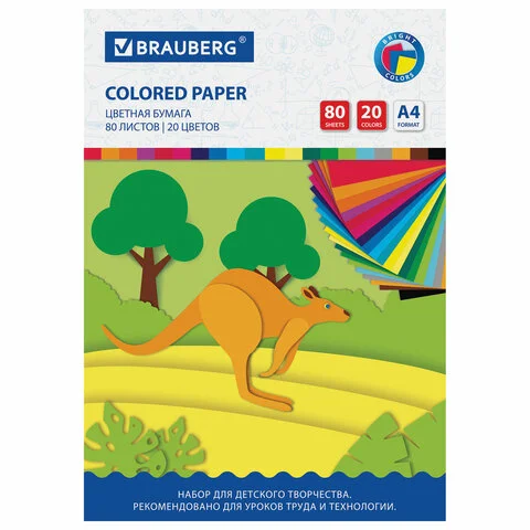 Цветная бумага А4 офсетная, 80 листов 20 цветов, в папке, BRAUBERG, 200х290 мм, 'Кенгуру', 113539