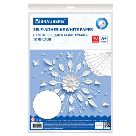 Цветная бумага А4 офсетная САМОКЛЕЯЩАЯСЯ, 10 листов, БЕЛАЯ, 80 г/м2, BRAUBERG, 129289