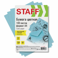 Цветная бумага для принтера Staff пастель голубая, А4, 100 листов, 80 г/м2