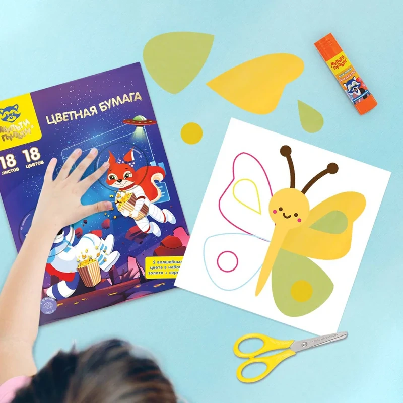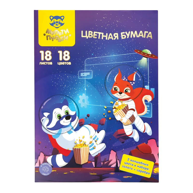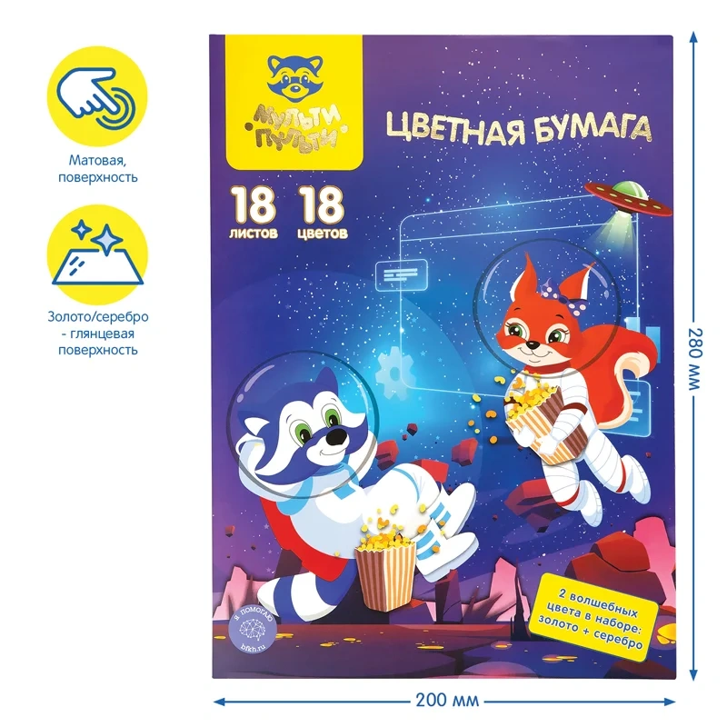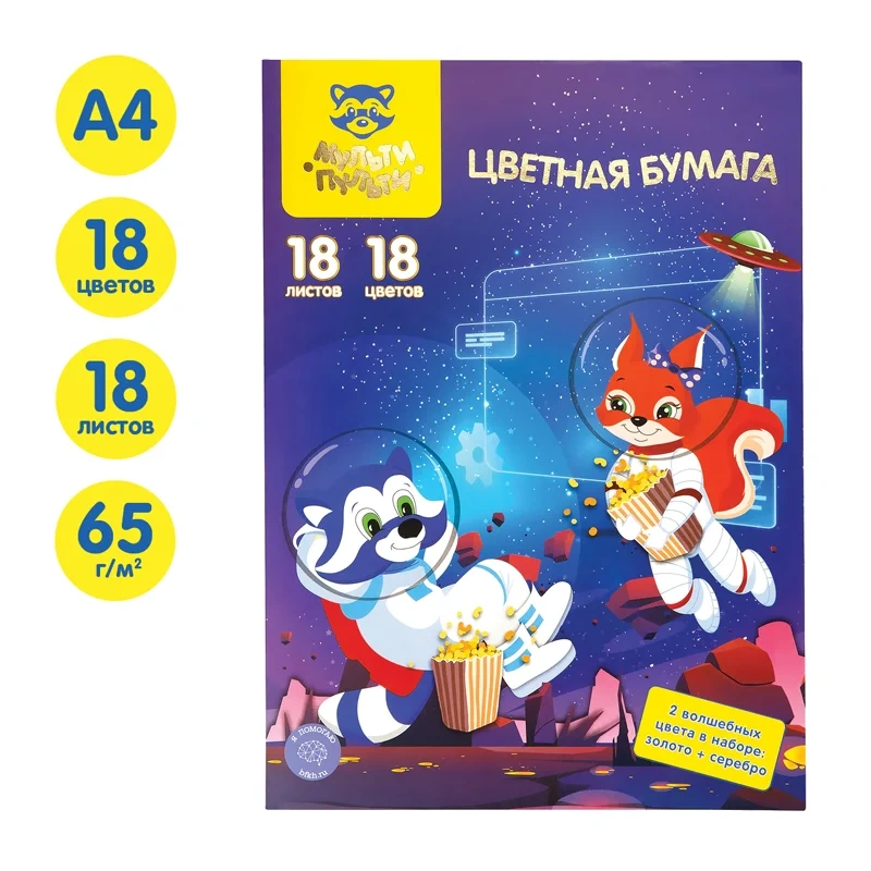 Цветная бумага Мульти-Пульти Енот в космосе. Волшебная 18 цветов, А4, 18 листов, офсетная