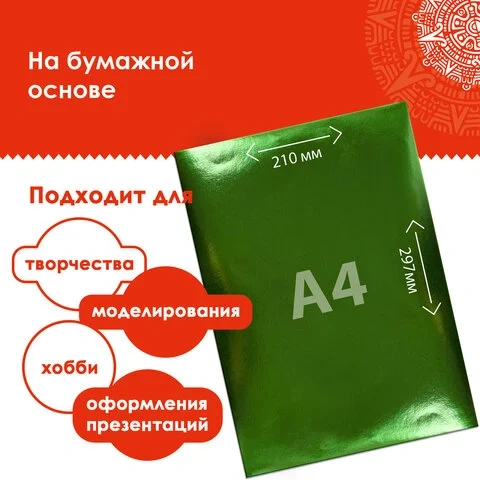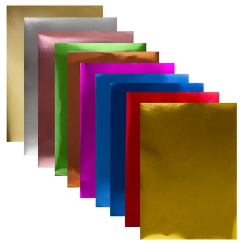 Настоящая алюминиевая фольга на бумажной основе представлена в формате А4 (210х297 мм). В наборе 10 листов и 10 ярких выразительных цветов. Поставляется в пакете.